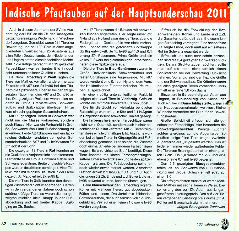Der Bericht der HSS 2011 in Wedemark vom Zuchtwart Jürgen Brunngräber in der Zeitschrift „Geflügelbörse“ .